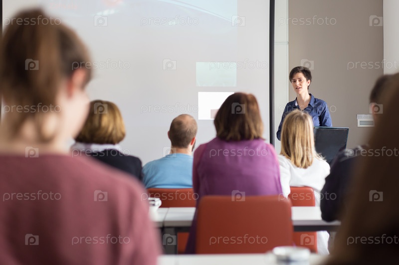 Женщина делаетпрезентацию в лекционном зале в университете