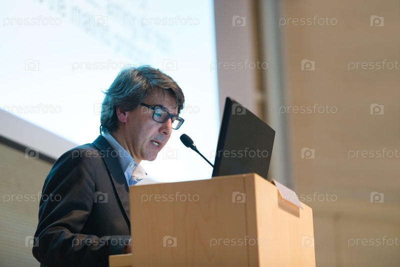 Докладчик выступает на трибуне на бизнес-конференции