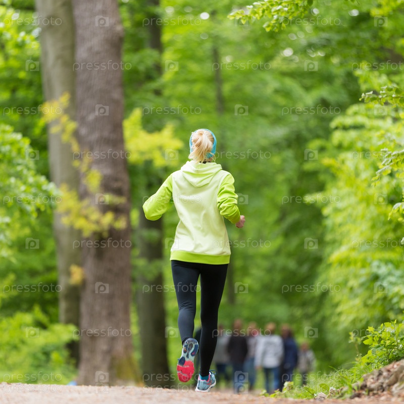 Спортивная молодая женщина бегает в лесу