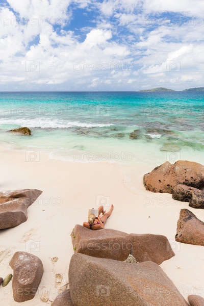 Женщина читает книгу на пляже Ансе Пататес на острове Ла-Диг, Сейшельские острова