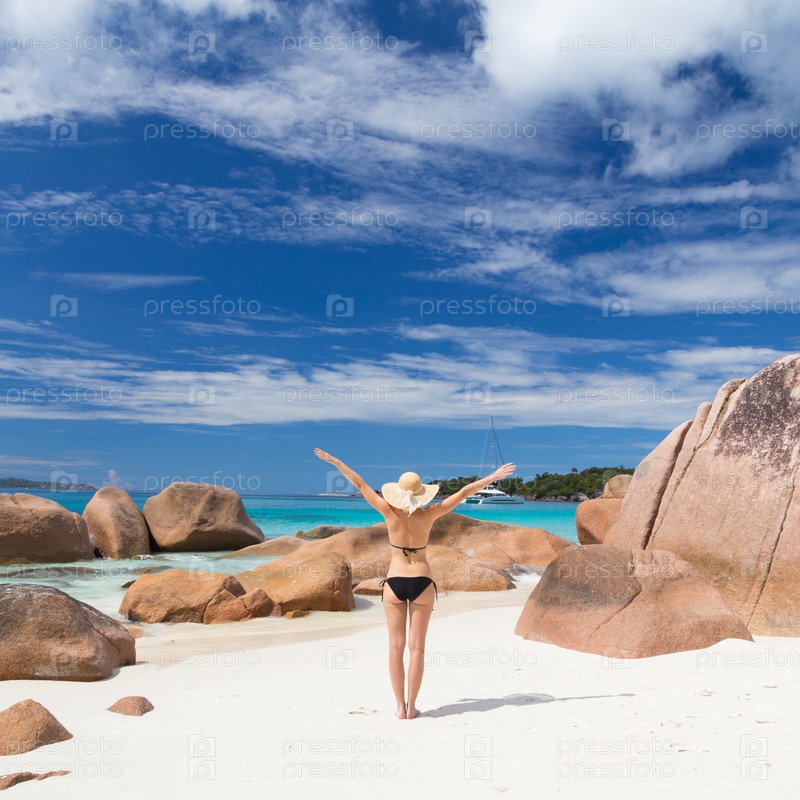 Женщина на пляже Ансе Лацио на острове Ла-Диг, Сейшельские острова
