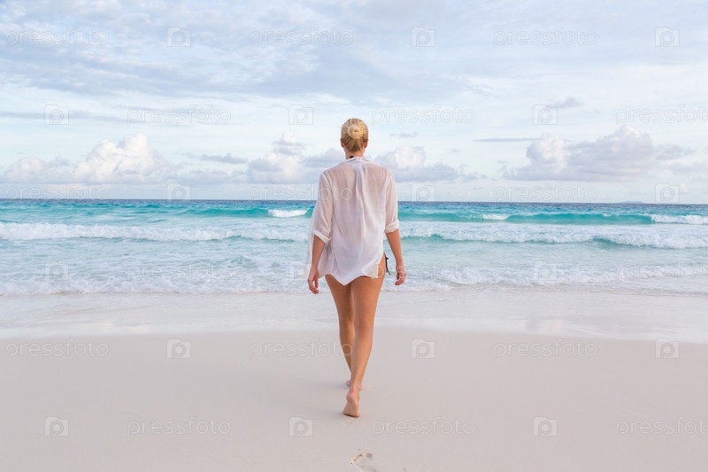 Женщина на летних каникулах на тропическом пляже острова Маэ, Сейшельские острова