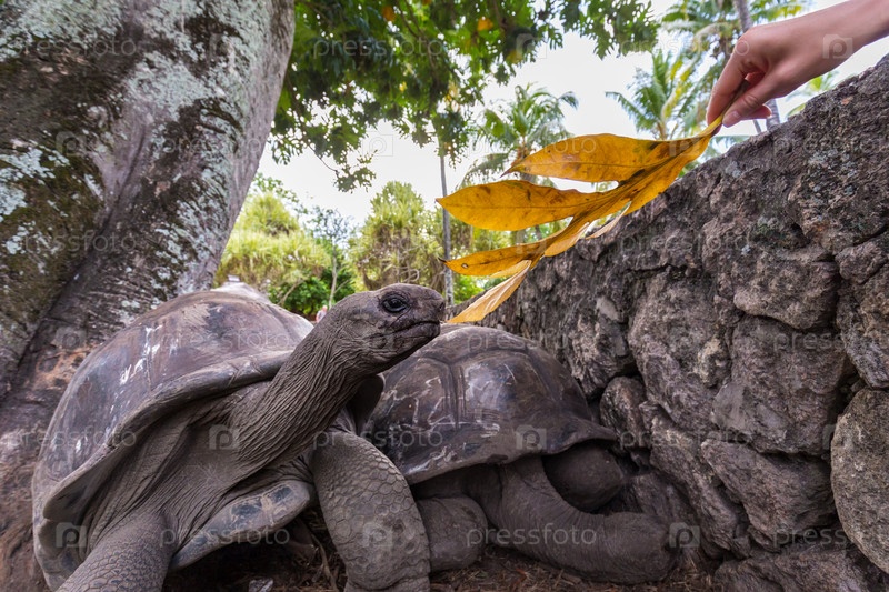 Кормление гигантских черепах Алдабры на острове Ла-Диг, Сейшельские острова