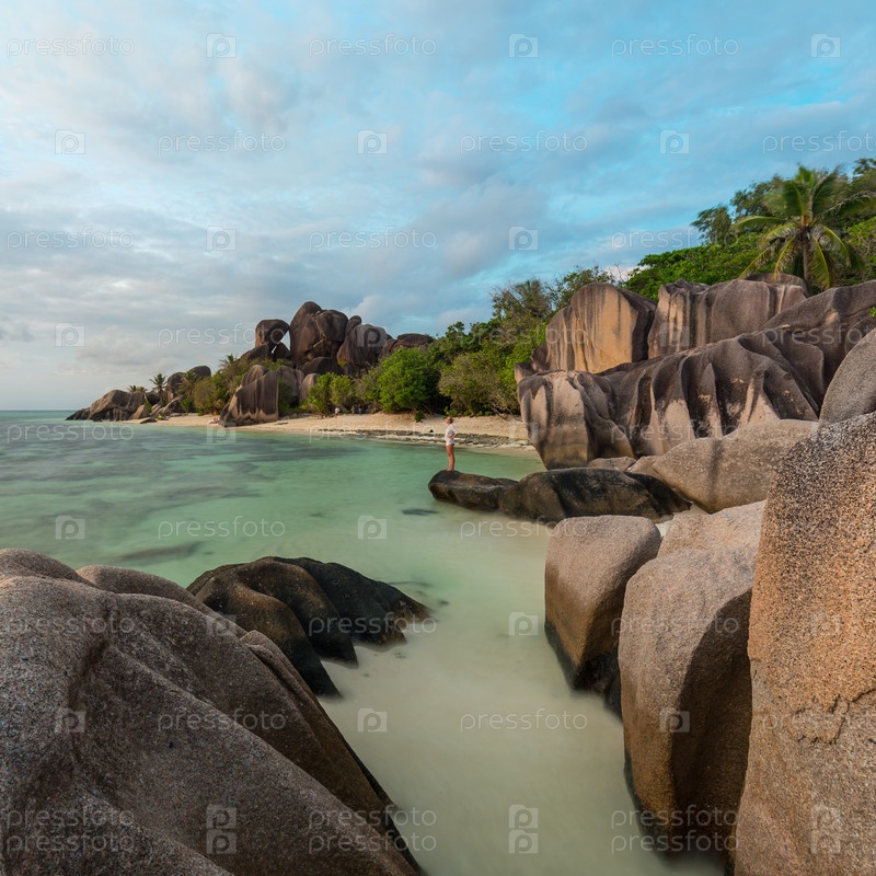Драматический закат на пляже Анс Сурс д'Аржан острова Ла-Диг, Сейшельские острова