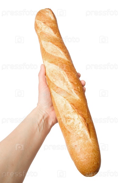 Французский багет в руке, изолированный на белом фоне