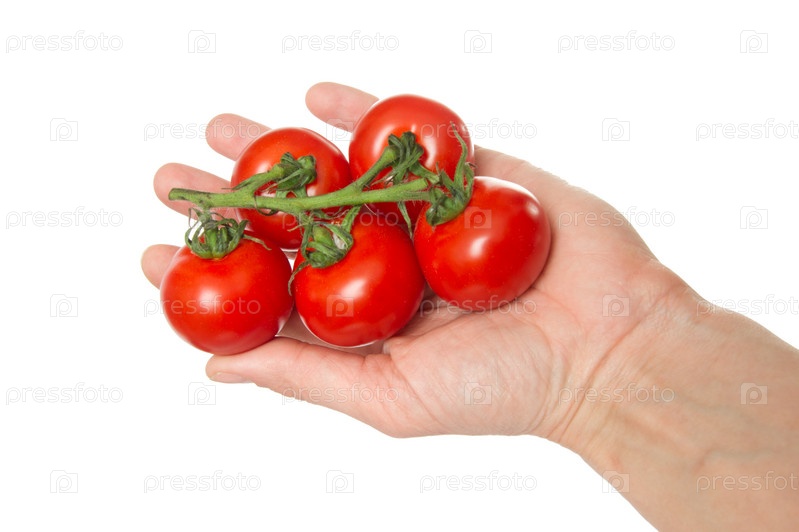 Красные помидоры в руке, изолированные на белом фоне