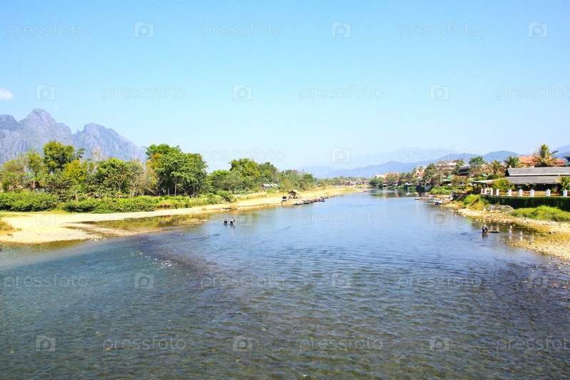 Пейзаж реки Song River в Ван-Вьенге, Лаос