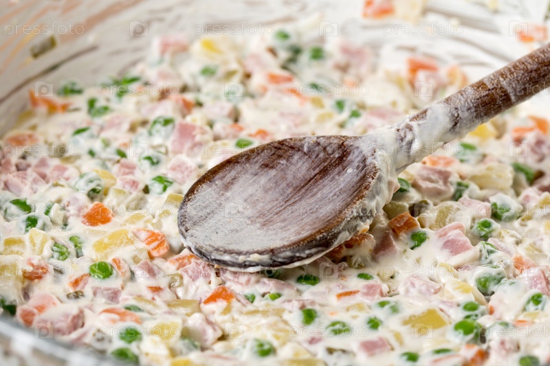Русский салат в миске с деревянной ложкой
