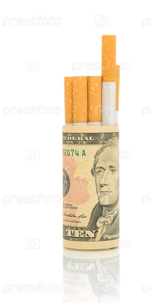 Не курить. Концепция дорогостоящей привычки. Сигареты и деньги на белом фоне