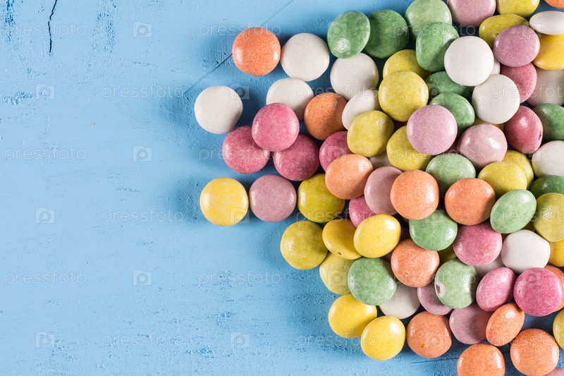 Куча круглых красочных конфет на синем деревянном столе