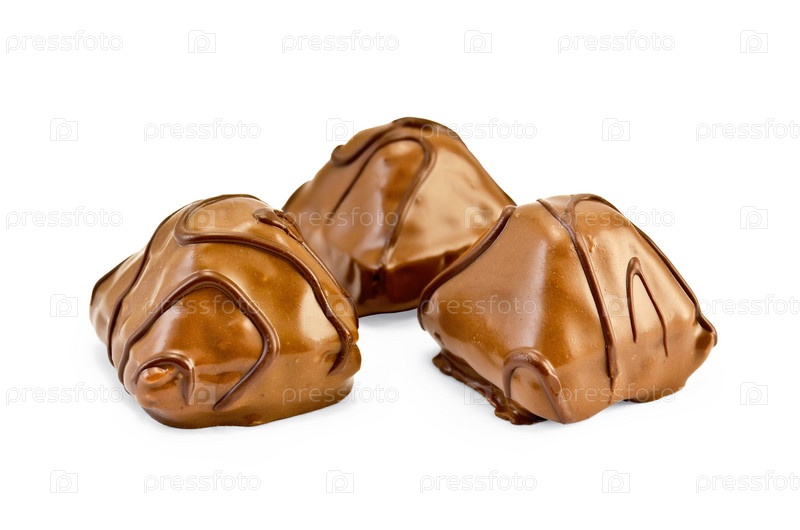 Три целые шоколадные конфеты с узором, изолированные на белом фоне