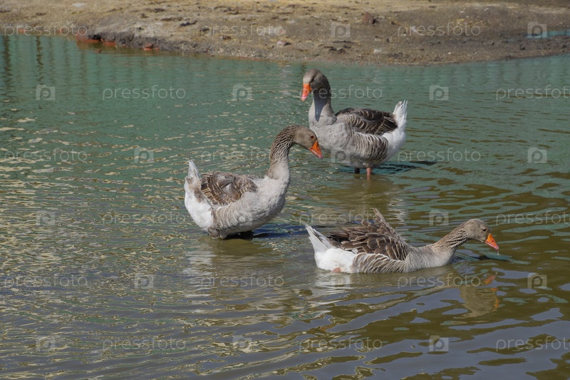 Домашние серые гуси в искусственном водоеме