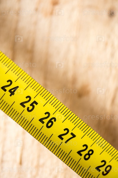 Желтая рулетка на фоне деревянных досок