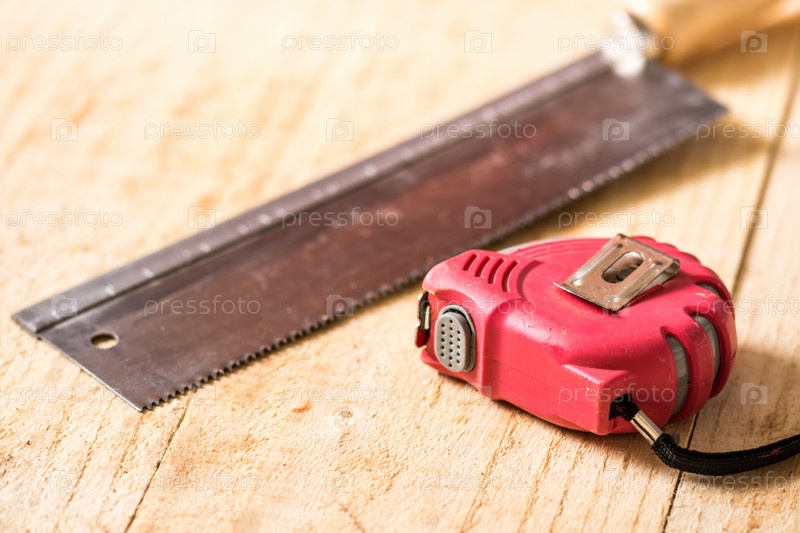 Рулетка строительная на фоне деревянных досок
