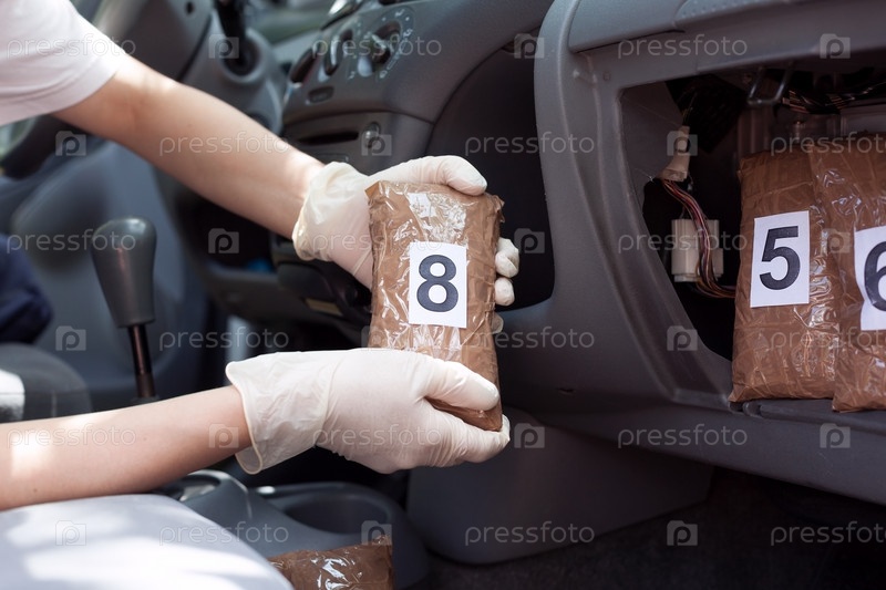 Полицейский держит пакет наркотиков, найденный в секретном отсеке в машине