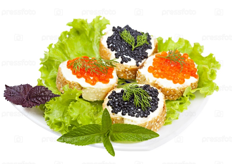 Бутерброды с красной и черной икрой на листьях салата, изолированных на белом фоне