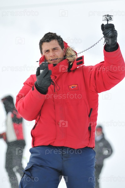 Молодой метеоролог измеряет скорость ветра зимой