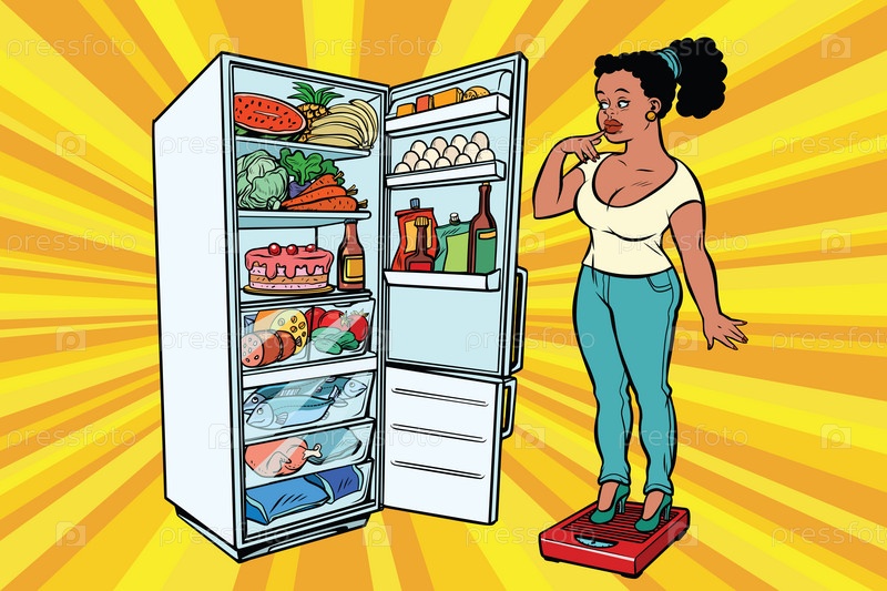 Диета. Молодая женщина на весах, стоит рядом с холодильником