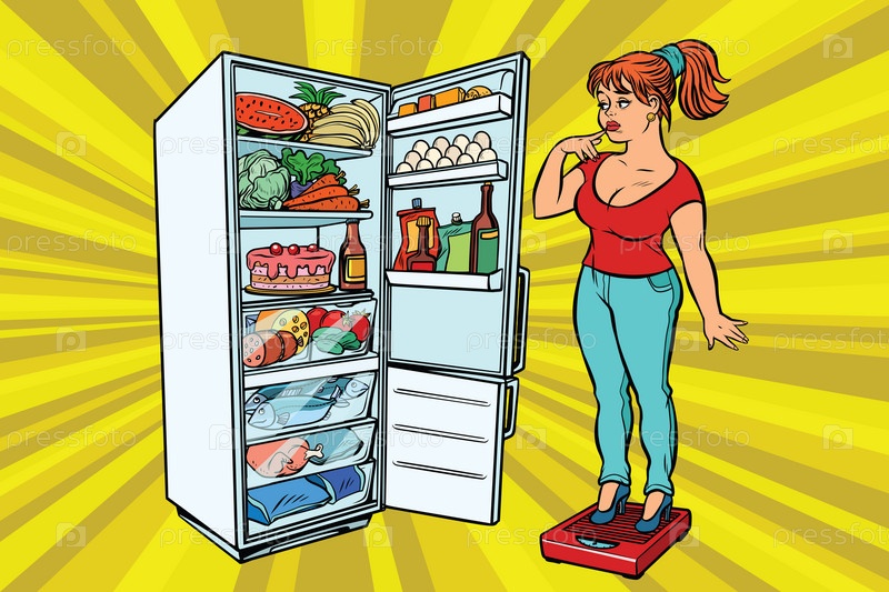 Диета. Молодая женщина на весах, стоит рядом с холодильником