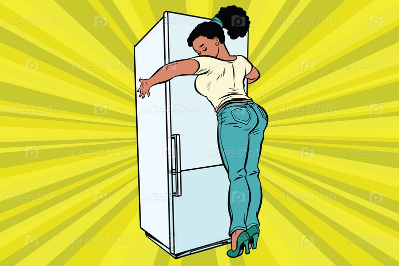 Диета и еда. Красивая женщина обнимает холодильник