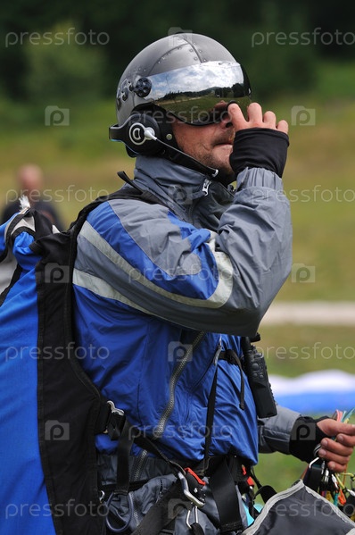 Человек в шлеме и очках на занятиях по параглайдингу на природе