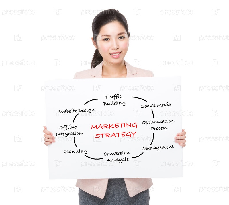 Предприниматель с плакатом маркетинговых стратегии