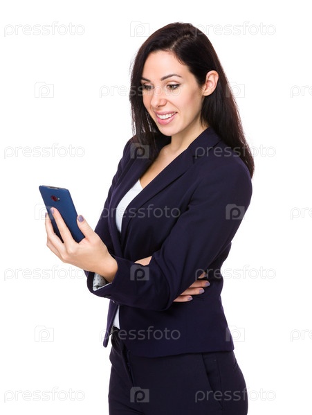 Брюнетка читает по мобильному телефону