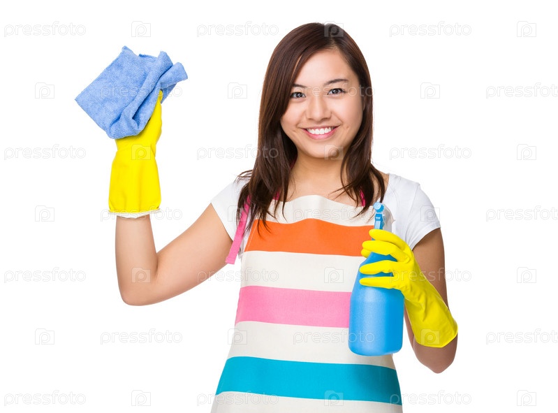Домохозяйка, использующая спрей для очистки