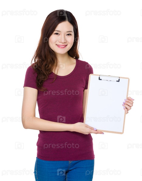Женщина показывает пустую планшетку