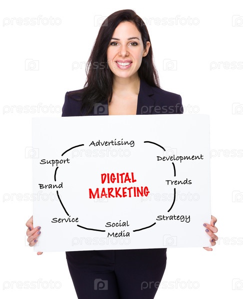 Предприниматель держит плакат с цифровой концепцией маркетинга