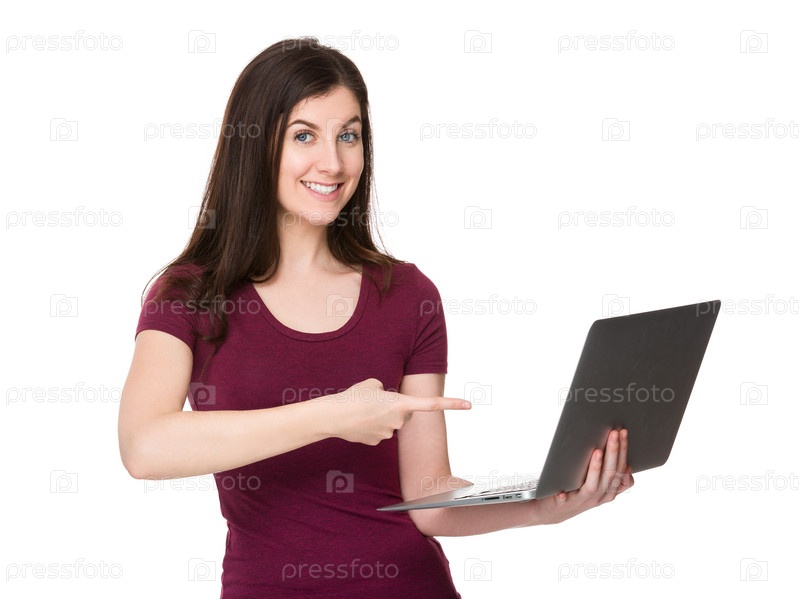 Молодая женщина указывает на экран портативного компьютера