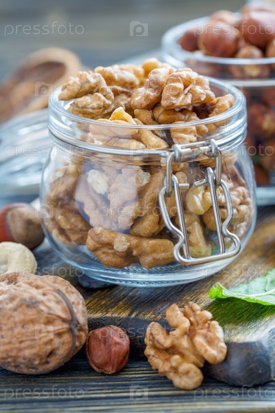 Грецкие орехи и фундук в стеклянных банках