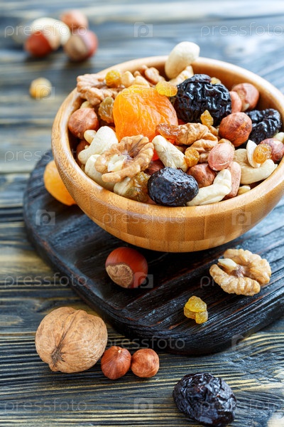 Сушеные фрукты и орехи в деревянной миске