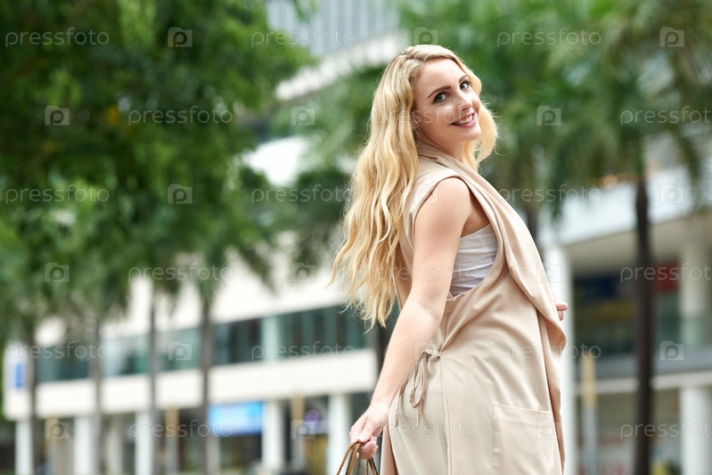 Беззаботная молодая женщина, наслаждаясь прогулкой по городу