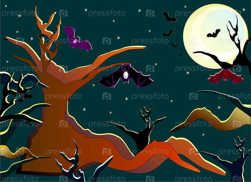 Рисунок - ночной лес с летучими мышами