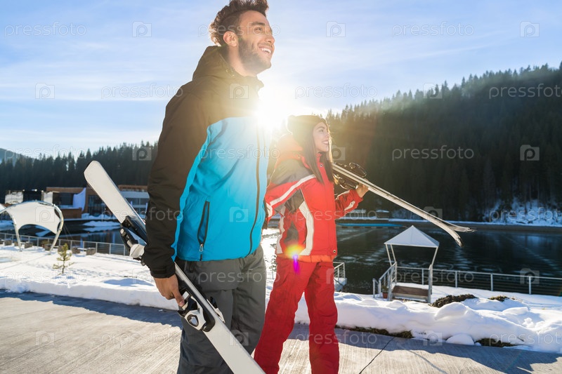 Счастливые улыбающиеся друзья на горнолыжном курорте
