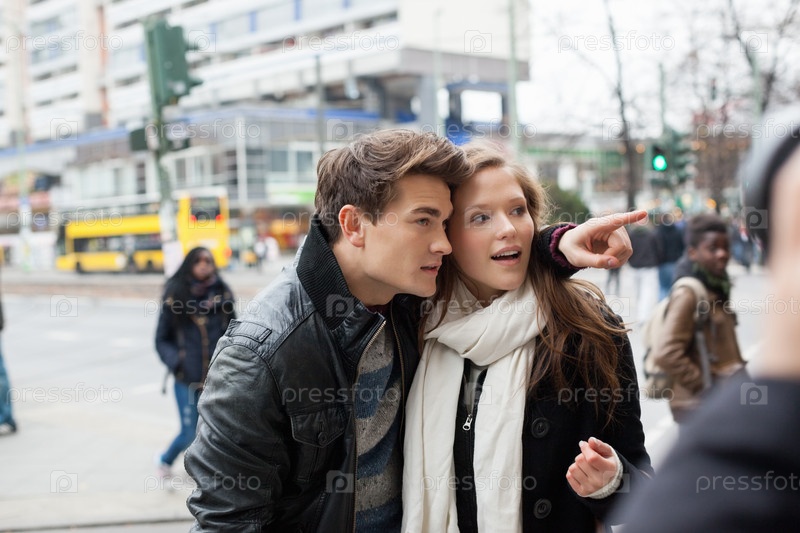 Человек показывает что-то женщине на городской улице