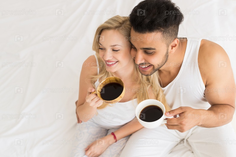Молодая пара с кофе, сидя в постели