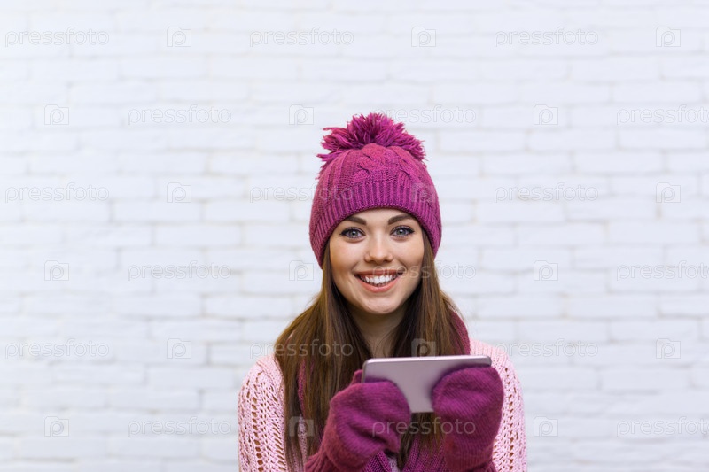 Привлекательная девушка в теплой одежде с телефоном