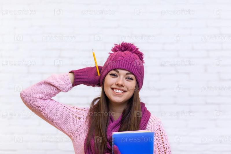 Привлекательная девушка-студентка в розовой шапке