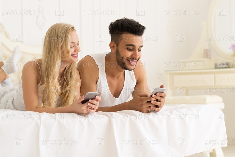 Молодая пара в постели с телефонами