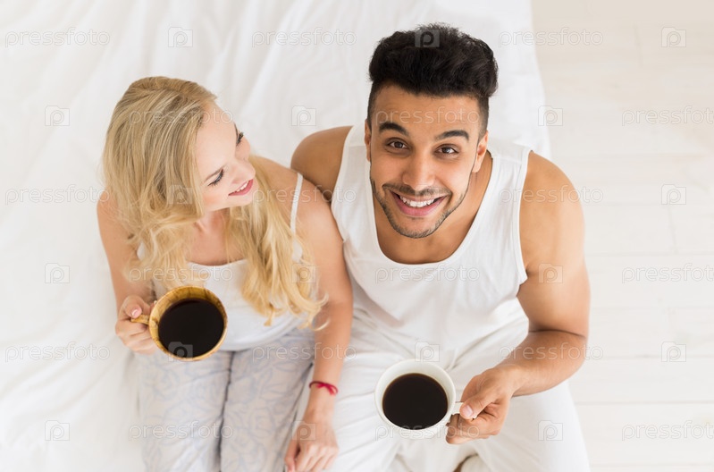 Молодая пара с кофе в постели