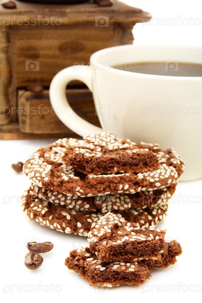 Чашка кофе и печенье с шоколадной крошкой на белом фоне