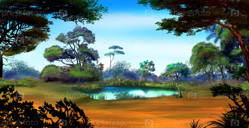 Небольшой пруд на лесной поляне в летний день