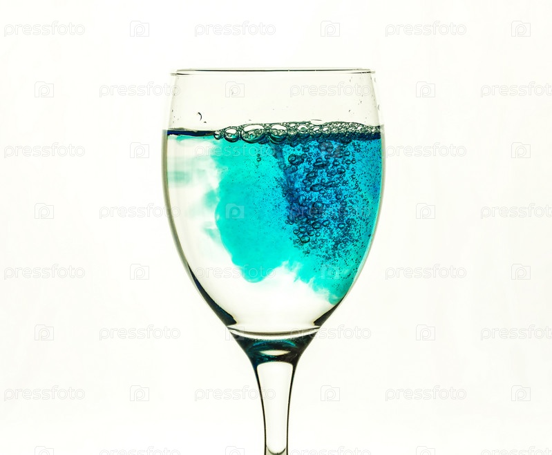 Стеклянный бокал с чистой водой и синей жидкостью