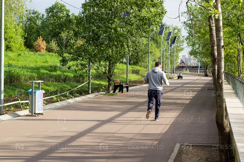 Молодой парень бегает в городском парке рано утром