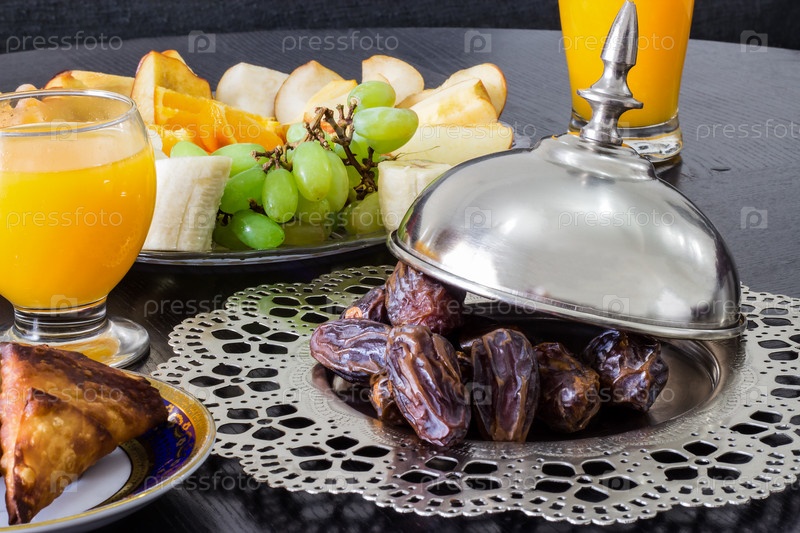 Сушеные финики, свежий апельсиновый сок с фруктами
