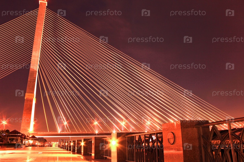 Мост Рамы VIII через реку Чао Прайя ночью в Бангкоке, Таиланд