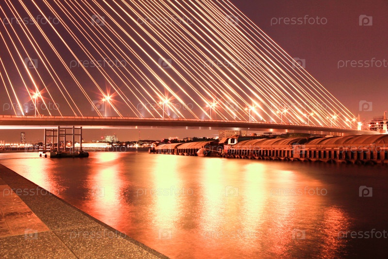 Мост Рамы VIII через реку Чао Прайя ночью в Бангкоке, Таиланд