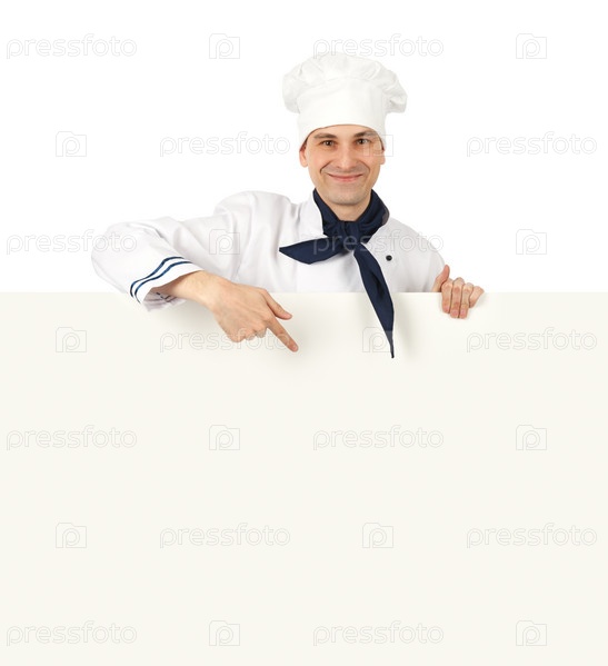Шеф-повар с баннером, изолированный на белом фоне